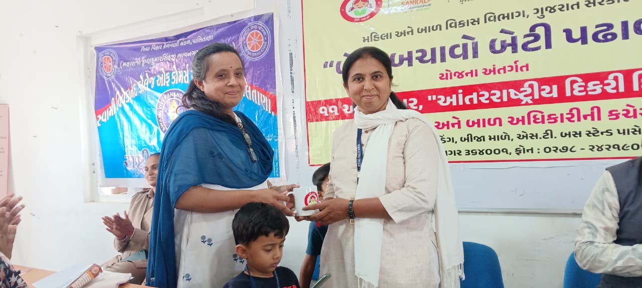 સ્વામી વિવેકાનંદ કૉલેજ પાલિતાણામાં મહિલા અને બાળ વિકાસ, ગુજરાત સરકાર “બેટી બચાવો બેટી પઢાવો” યોજના અંતર્ગત 11 ઓક્ટોબર આંતર રાષ્ટ્રીય દીકરી દિવસની ઉજવણી કરવામાં આવી હતી.જેમાં હેતલબેન દવે (દહેજ પ્રતિબંધક અધિકારી અને સહરક્ષણ અધિકારી,ભાવનગર અને ડિસ્ટ્રીક હબ ફોર એમ્પાવારમેન્ટ ઓફ વુમન,ભાવનગર અને અભયમ્ 181 ની ટીમ પણ ઉપસ્થિત રહી હતી