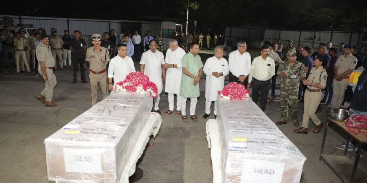 અમદાવાદ, સંજીવ રાજપૂત: જમ્મુ કાશ્મીરનાં અનંતનાગ જિલ્લાના પહેલગામ ખાતે જમ્મુ-કાશ્મીરમાં આતંકી હુમલામાં મૃત્યુ પામેલા ભાવનગરના બે સ્વર્ગસ્થ નાગરિકોના મૃતદેહ વિમાન માર્ગે અમદાવાદ એરપોર્ટ પર લવાયા હતા. અમદાવાદ એરપોર્ટ પર આરોગ્ય મંત્રી ઋષિકેશભાઈ પટેલ, ગૃહ રાજ્યમંત્રી હર્ષ સંઘવી, પ્રોટોકોલ મંત્રી મંત્રી જગદીશભાઈ વિશ્વકર્મા, મંત્રી મુકેશ પટેલે શ્રદ્ધાંજલિ અર્પણ કરી હતી.