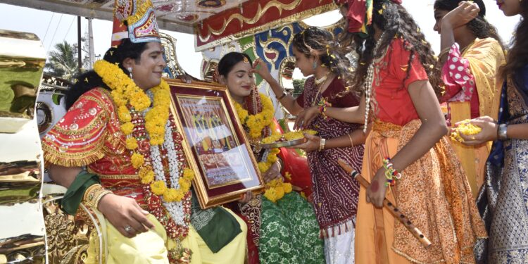 દેવભૂમિ દ્વારકા, સંજીવ રાજપૂત: માધવપુર ઘેડ ખાતે ભગવાન શ્રીકૃષ્ણ તથા રુકમણીજીના વિવાહનો પ્રસંગ પૂર્ણ થતા દ્વારકા ખાતે ભગવાન શ્રીકૃષ્ણ-રુકમણીજીના સત્કાર સમારોહ શોભાયાત્રાનો આરંભ આજે થયો હતો. માધવપુર ઘેડથી હર્ષદ ગાંધવી ખાતે પહોચેલી શોભાયાત્રાનું રાજ્યના પ્રવાસન મંત્રી મુળુભાઈ બેરાના સહિતના મહાનુભાવો દ્વારા ભવ્ય સ્વાગત કરવામાં આવ્યું હતું.