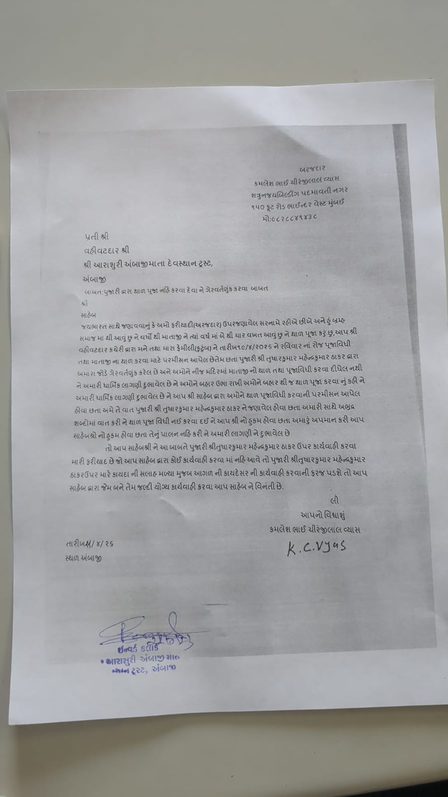*અંબાજી – થાળ પૂજા કરવા બાબતે ભટ્ટજી મહારાજ દ્વારા યાત્રિક સાથે અભદ્ર વર્તન કરતા લેખિત ફરિયાદ…..*