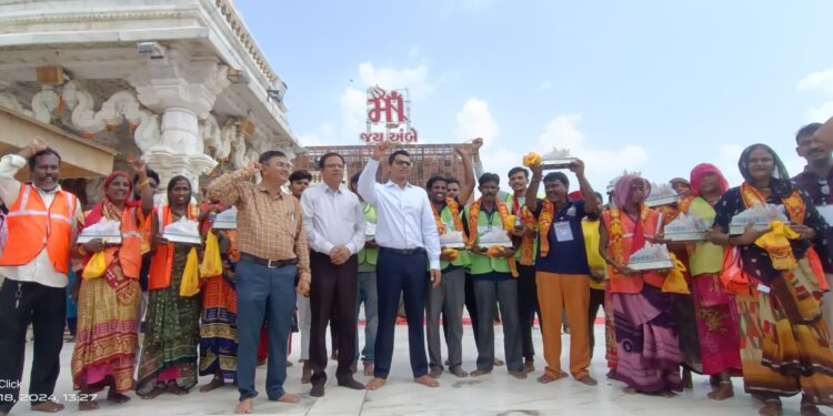 અંબાજી, સંજીવ રાજપૂત: અંબાજી ભાદરવી પૂનમના મેળામાં સ્વચ્છતાના યોધ્ધાઓ એવા સફાઈ કર્મચારીઓનું જિલ્લા કલેકટર અને શ્રી આરાસુરી અંબાજી માતા દેવસ્થાન ટ્રસ્ટના ચેરમેન મિહિર પટેલ દ્વારા વિશેષ સન્માન કરવામાં આવ્યું હતું. સમગ્ર મેળા દરમિયાન મેળાની સફાઈની જવાબદારી ૧૨૦૦ જેટલા સફાઈ કર્મીઓએ નિષ્ઠાપૂર્વક બજાવી છે.