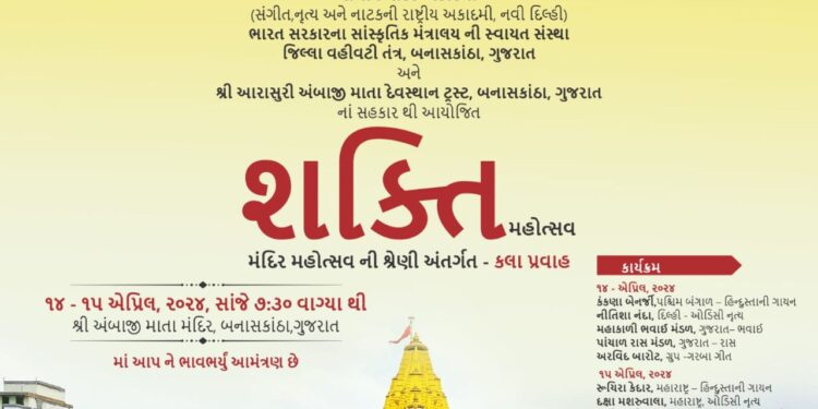 જે અન્વયે તા. ૧૪ અને ૧૫ એપ્રિલ ૨૦૨૪ ના રોજ સાંજે ૦૭:૩૦ કલાકે જિલ્લા વહીવટીતંત્ર, બનાસકાંઠા, અને શ્રી આરાસુરી અંબાજી માતા દેવસ્થાન ટ્રસ્ટ, અંબાજીના સહયોગથી શક્તિ ઉત્સવનું આયોજન કરવામાં આવ્યું છે. જેના ભાગરૂપે ૧૪ એપ્રિલ ૨૦૨૪ના રોજ કંકણા બેનર્જી, પશ્ચિમ બંગાળ, હિન્દુસ્તાની ગીત – સંગીત,