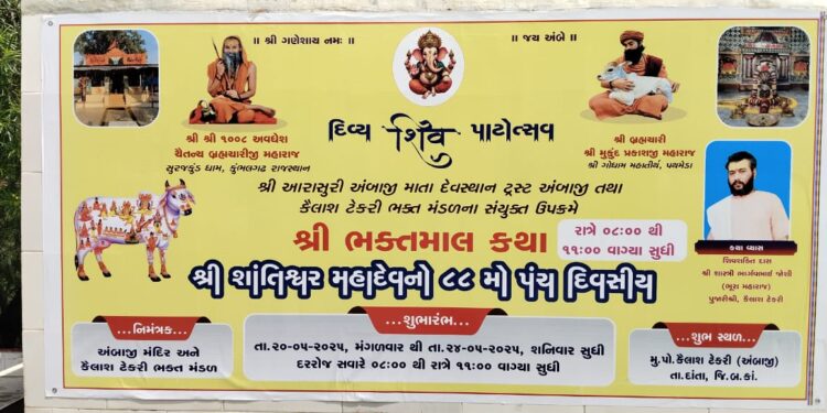 યાત્રાધામ અંબાજીમાં ધૂમધામથી યોજના લાભ પંચ દિવસે દિવ્ય શિવ પાટોત્સવ માં ધર્મ ધજા પ્રતિષ્ઠા, શ્રીરામ મહાયજ્ઞ, શિવ મહાભિષેક, પોથીયાત્રા અંબાજી મંદિર થી કૈલાશ ટેકરી સુધી, શ્રી ભક્ત માલ સત્સંગ જેવા અનેકો ધાર્મિક કાર્યક્રમો ધૂમધામ થી યોજવામાં આવશે.