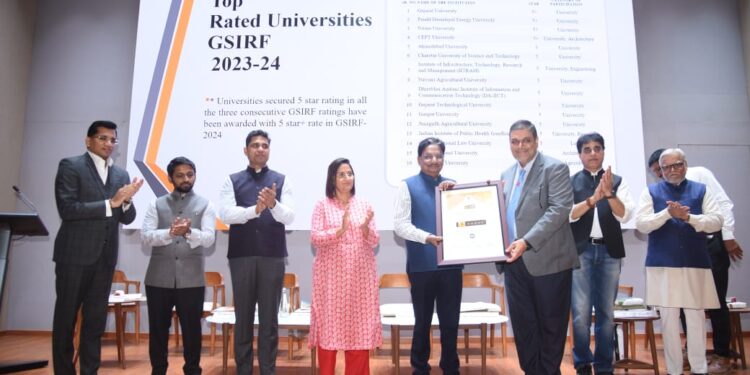 આ પ્રસંગે ઉચ્ચ અને ટેકનિકલ શિક્ષણ મંત્રી ઋષિકેશભાઈ પટેલ તેમજ શિક્ષણ રાજ્ય મંત્રી પ્રફૂલ્લભાઈ પાનશેરિયાના હસ્તે ગુજરાત સ્ટેટ ઇન્સ્ટીટ્યુશનલ રેટિંગ ફ્રેમવર્ક ૨૦૨૩-૨૪ હેઠળ ફાઈવ સ્ટાર પ્લસ અને ફાઈવ સ્ટારનું રેટિંગ પ્રાપ્ત ગુજરાતની ટોપ ૧૬ યુનિવર્સિટીઓના વાઈસ ચાન્સેલરોને પ્રમાણપત્ર આપી સન્માનિત કર્યા હતા .
