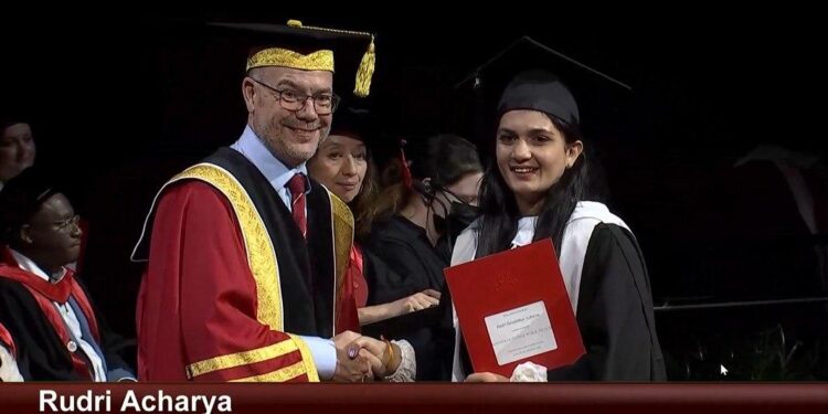 એબીએનએસ, પાટણ : પાટણ જગન્નાથ મંદિર ટ્રસ્ટના મેનેજિંગ ટ્રસ્ટી પિયુષભાઈ આચાર્યની ભત્રીજી અને પાટણના જાણીતા બિઝનેસમેન બીરજુભાઈ આચાર્યની સુપુત્રી ચિરંજીવી રુદ્રી આચાર્ય એ ગ્રિફિથ યુનિવર્સિટી ક્વીન્સલેન્ડ ઓસ્ટ્રેલિયા મા ગ્લોબલ પબ્લિક હેલ્થમાં બે વર્ષનો માસ્ટર અભ્યાસ પૂર્ણ કરી ડીગ્રી પ્રાપ્ત કરી છે.