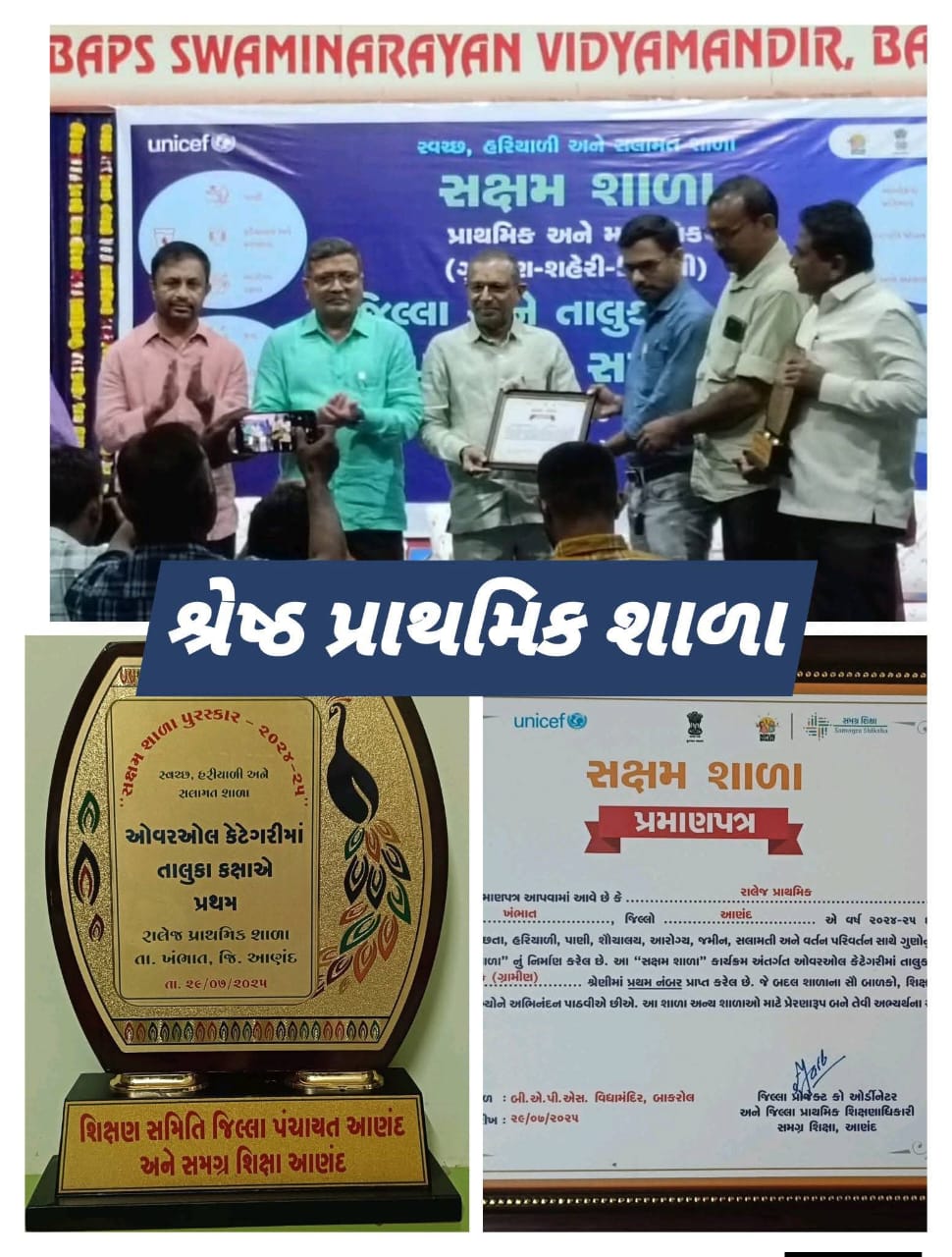 આણંદ જિલ્લા શિક્ષણ સમિતિ અને SSA દ્વારા ખંભાત તાલુકાની વર્ષ ૨૦૨૫- ૨૬ માટે શ્રેષ્ઠ સક્ષમ & સ્વચ્છ શાળા નો એવોર્ડ મેળવનાર શ્રી રાલેજ પ્રાથમિક શાળા ના આચાર્ય શ્રી કિરીટભાઈ શનાભાઈ પટેલ….