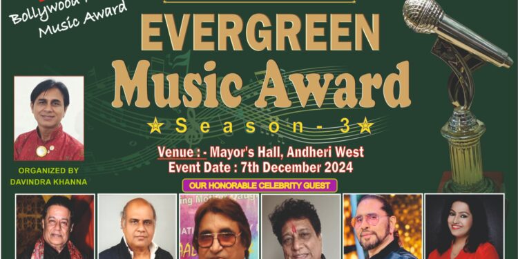 मुंबई, वीएस नेशन मीडिया ग्रुप और ताल म्यूजिक एंड फिल्म्स के संयुक्त तत्वाधान में 7 दिसंबर को अंधेरी(वेस्ट), स्थित मेयर हॉल में एवरग्रीन म्यूजिक अवॉर्ड सीजन 3 का आयोजन किया जा रहा है। इस समारोह में संगीत के क्षेत्र में उल्लेखनीय योगदान देने वाले लीजेंड, नामचीन और नवोदित प्रतिभाओं को अवार्ड देकर सम्मानित किया जाएगा।