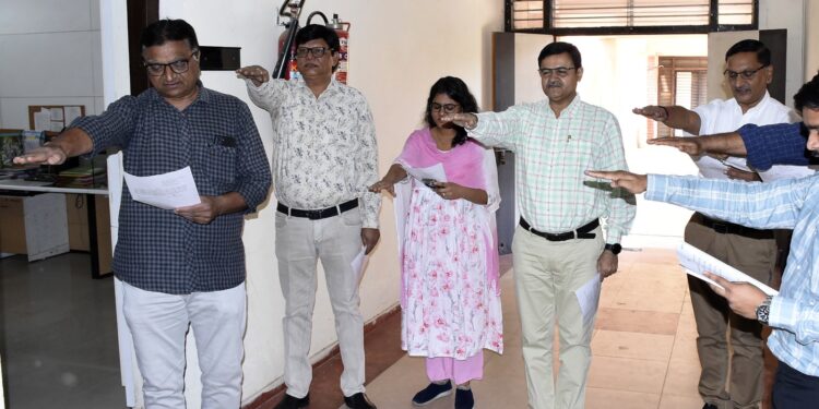 ગાંધીનગર, સંજીવ રાજપૂત: સવારે 11.00 કલાકે ગાંધીનગર ખાતે માહિતી નિયામકની કચેરીમાં માહિતી નિયામક કે.એલ.બચાણીની ઉપસ્થિતિમાં કર્મયોગીઓ દ્વારા તા.૨૧ મે, “આતંકવાદ વિરોધી દિવસ” નિમિત્તે દેશમાં આતંકવાદી પ્રવૃત્તિઓનો વિરોધ તેમજ કોઈપણ પ્રકારની હિંસાથી દૂર રહેવાના સામૂહિક રીતે શપથ લેવામાં આવ્યા હતા.
