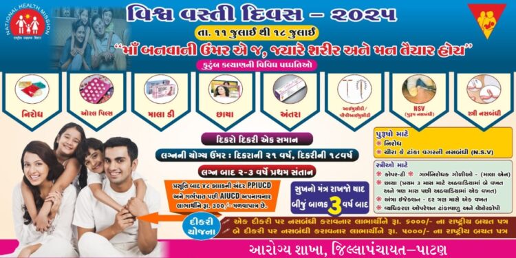 પાટણ, સંજીવ રાજપૂત: પાટણ જિલ્લા ખાતે ૧૧ જુલાઈ વિશ્વ વસ્તી દિવસ નિમિત્તે જન જાગૃતિ લાવવા કલેકટર અને જીલ્લા વિકાસ અધિકારીના માર્ગદર્શન હેઠળ ખાસ ઉજવણી કરવામાં આવશે. આ માટે ભારત સરકાર તથા ગુજરાત સરકાર આરોગ્ય વિભાગ તરફથી વસ્તી સ્થિરતા લાવવા સારૂ અને સામાન્ય જનતામાં આ બાબતની જાગૃતિ કેળવવા સારૂ દરેક તાલુકા અને આયુષ્માન આરોગ્ય મંદિર કક્ષાએ આ વિષયને લગતી પ્રવૃતિઓ કરવામાં આવશે.