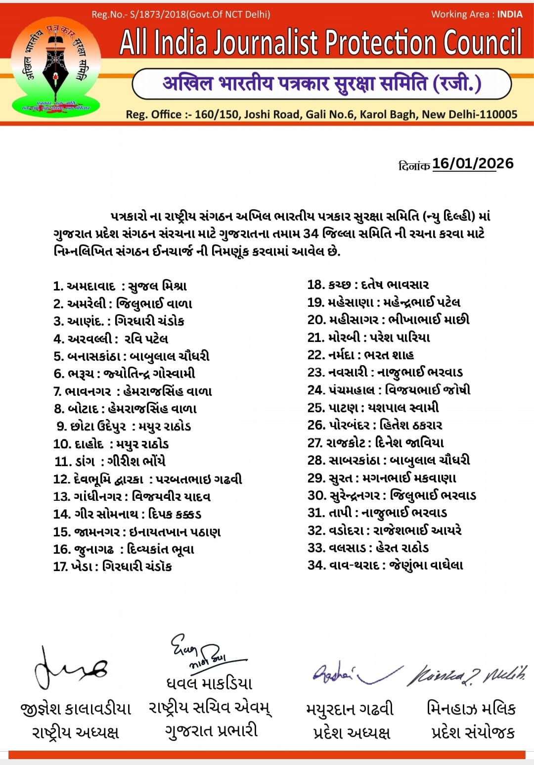 ગુજરાત પ્રદેશ પ્રભારી ધવલ માકડિયા દ્વારા 34 જિલ્લાના સંગઠન ઇન્ચાર્જ ની નિમણૂંક કરવામાં આવી