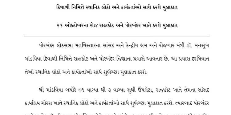 પોરબંદર લોકસભા મત વિસ્તારના સાંસદ અને ભારત સરકારના શ્રમ અને રોજગાર તથા રમતગમત અને યુવા બાબતના કેબિનેટ મંત્રી ડૉ. મનસુખ માંડવિયાના પ્રયાસોથી રાજકોટ અને દિલ્હી વચ્ચે એર ઇન્ડિયા અને ઇન્ડિગોની એમ કુલ બે નવી ફ્લાઈટ આવતીકાલે તા. 26/10/2025ના રોજ લાભ પાંચમના દિવસથી શરૂ થનાર છે.