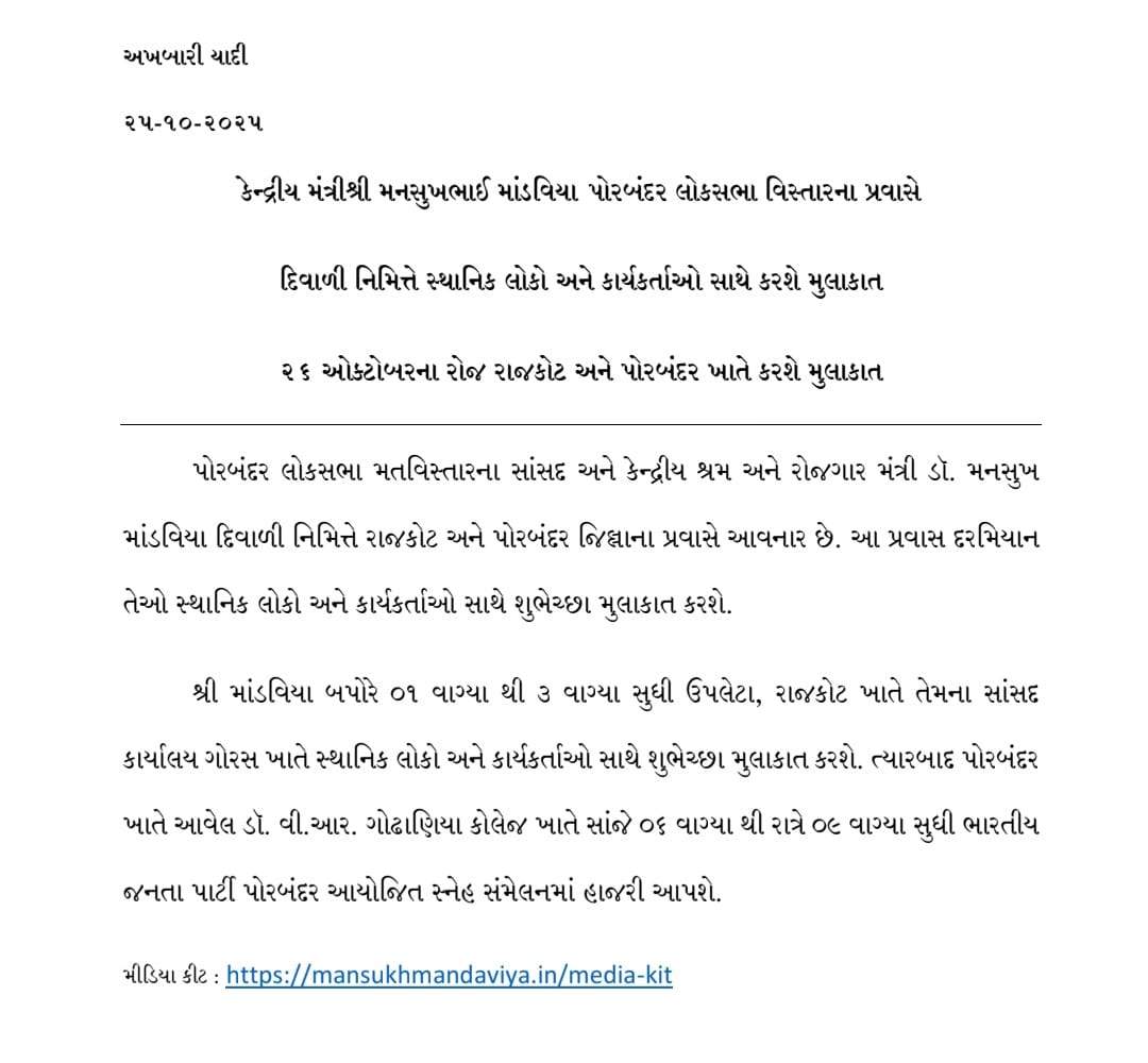 પોરબંદર લોકસભા મત વિસ્તારના સાંસદ અને ભારત સરકારના શ્રમ અને રોજગાર તથા રમતગમત અને યુવા બાબતના કેબિનેટ મંત્રી ડૉ. મનસુખ માંડવિયાના પ્રયાસોથી રાજકોટ અને દિલ્હી વચ્ચે એર ઇન્ડિયા અને ઇન્ડિગોની એમ કુલ બે નવી ફ્લાઈટ આવતીકાલે તા. 26/10/2025ના રોજ લાભ પાંચમના દિવસથી શરૂ થનાર છે.