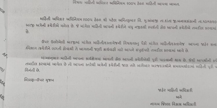 જે બાબતે અંબાજી ના એક જાગૃત નાગરિક દ્વારા વર્ષ ૨૦૨૫ ના ભાદરવી પૂનમ ના મહા મેળા માં ફાળવાયેલ પ્લોટ અને તેની આવક અંગેની માહિતી માંગતી RTI કરતા અધિકારી દ્વારા જવાબ આપવાને બદલે અરજી ને તાલુકા વિકાસ અધિકારી ના બદલે અંબાજી મંદિર દેવસ્થાન ટ્રસ્ટ ને આપતા નવાઈ પમાડે તેવી સ્થિતિ ઊભી કરી હતી.
