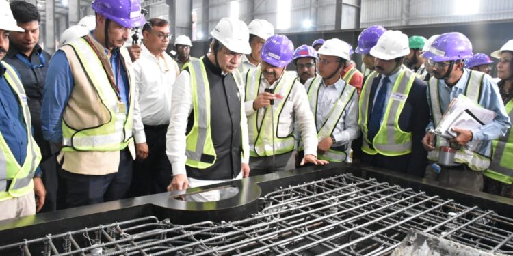 સુરત:એબીએનએસ: કેન્દ્રીય રેલવે મંત્રી અશ્વિની વૈષ્ણવે માંગરોળ તાલુકાના કિમ ખાતે બુલેટ ટ્રેન ટ્રેક સ્લેબ મેન્યુફેક્ચરિંગ ફેક્ટરીની મુલાકાત લીધી હતી અને ૧૯ એકર વિસ્તારમાં વિકસાવવામાં આવેલી સ્લેબ ફેક્ટરીમાં થઈ રહેલી કામગીરીનું નિરીક્ષણ કર્યું હતું. નેશનલ હાઈસ્પીડ રેલ કોર્પોરેશન લિ.ના મેનેજિંગ ડિરેક્ટરશ્રી વિવેક ગુપ્તાએ કેન્દ્રીય રેલવે મંત્રીશ્રીને ફેક્ટરીની સમગ્રલક્ષી કાર્યપદ્ધતિથી માહિતગાર કર્યા હતા.