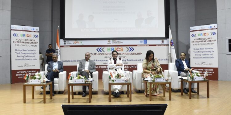 ગાંધીનગર, સંજીવ રાજપૂત; નેશનલ ફોરેન્સિક સાયન્સીસ યુનિવર્સિટી-ગાંધીનગર ખાતે આયોજિત “બ્રિક્સ – યૂથ કાઉન્સિલ એન્ટરપ્રિન્યોરશિપ પ્રિ-કન્સલ્ટેશન”નો શુભારંભ સમારોહ ઉદ્યોગ મંત્રી બલવંતસિંહ રાજપુતના અધ્યક્ષ સ્થાને યોજાયો હતો. યુવા ઉદ્યોગસાહસિકો, સંશોધકોના વિચારો-કલ્પનાઓને મૂર્તિમંત કરવા માટેનો એક મંચ પૂરો પાડવા ભારત સરકારના યુવા બાબતો અને રમત ગમત વિભાગ તેમજ ગ્લોબલ કાઉન્ટર ટેરરિઝમ કાઉન્સિલના સંયુક્ત ઉપક્રમે આ કાર્યક્રમનું આયોજન કરવામાં આવ્યું છે.