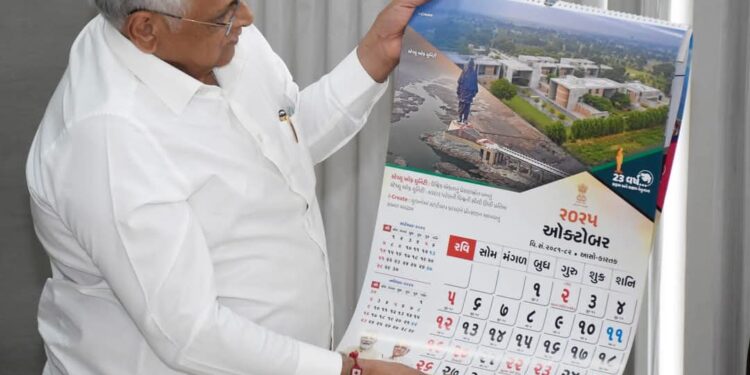ગાંધીનગર, સંજીવ રાજપૂત: રાજ્યના મુખ્યમંત્રી ભુપેન્દ્રભાઇ પટેલે વર્ષ ૨૦૨૫ના કેલેન્ડરનું ગાંધીનગર ખાતે વિમોચન કર્યું હતું. આ કેલેન્ડર “સફળ અને સક્ષમ નેતૃત્વના ૨૩ વર્ષ” થીમ પર તૈયાર કરવામાં આવ્યું છે. જેમાં રાજ્યના વિવિધ ૨૩ આઇકોનિક સ્થળોની નયનરમ્ય તસવીરો અને અગત્યની ટૂંકી વિગતો રજૂ કરવામાં આવ્યા છે.