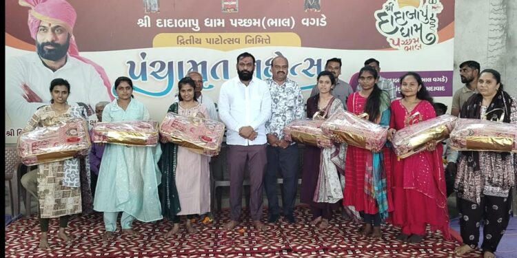 ગત તા.૧૦/૧૧/૨૦૨૪ ના રોજ આ સમૂહ લગ્ન માં જોડાયેલ સાધુ સમાજ ના ૧૧ દીકરી બા ઓ ને પાનેતર ના સ્વરૂપે કલાત્મક હાથ ભરત ગૂંથણ ની ચણીયા ચોળી પોતાના સ્વહસ્તે દાદા બાપુ ધામ પચ્છમ ભાલ મુકામે કરિયાવર અર્પણ પૂજન ના કાર્યક્રમ માં રૂબરૂ માં બોલાવી અને અર્પણ કરેલ તેમજ કરિયાવર ની બીજી ખૂટતી વસ્તુ માં માટલું દરેક દીકરી ને ડ્રેસ તેમજ સાડી અને અન્ય બીજી પાંચ આઈટમ પણ આપેલ આ પ્રસંગે ગુજરાત સાધુ સમાજ ના યુવા પ્રમુખ શ્રી મનોજબાપુ મેંશવાણિયા તેમજ સેવા ના ભેખધારી શ્રી હરિરામ બાપુ ધારપીપળા સાધુ સમાજ સમૂહ લગ્ન સમિતિ ના પ્રમુખ નીતાબેન ગોંડલીયા તેમજ ૧૦૦ ઉપરાંત સાધુ સમાજ ના ગુજરાત ના સેવાભાવી વડીલો અને યુવાનો એ મોટા પ્રમાણ માં હાજર રહેલ