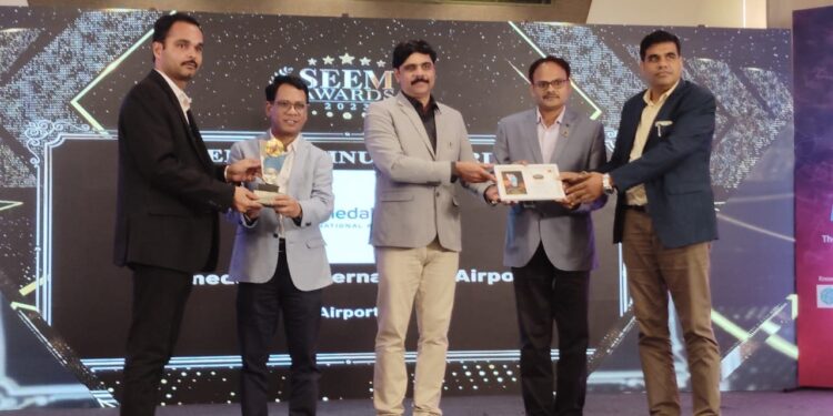 અમદાવાદ, સંજીવ રાજપૂત: વૈશ્વિક સ્તરે વૈવિધ્યસભર અદાણી ગ્રુપની ફ્લેગશિપ કંપની અદાણી એન્ટરપ્રાઈઝીસની પેટાકંપની અદાણી એરપોર્ટ હોલ્ડિંગ્સ લિમિટેડ (AAHL) સંચાલિત સરદાર વલ્લભભાઈ પટેલ ઈન્ટરનેશનલ એરપોર્ટ, અમદાવાદ(SVPIA) ને એરપોર્ટ સેક્ટરમાં પ્રતિષ્ઠિત પ્લેટિનમ એવોર્ડ એનાયત થયો છે. 26 સપ્ટેમ્બરે નવી દિલ્હી ખાતે આયોજીત સોસાયટી ઓફ એનર્જી એન્જિનિયર્સ એન્ડ મેનેજર્સ (SEEM) એવોર્ડ્સ કેટેગરીમાં આ સન્માન પ્રાપ્ત થયું છે.
